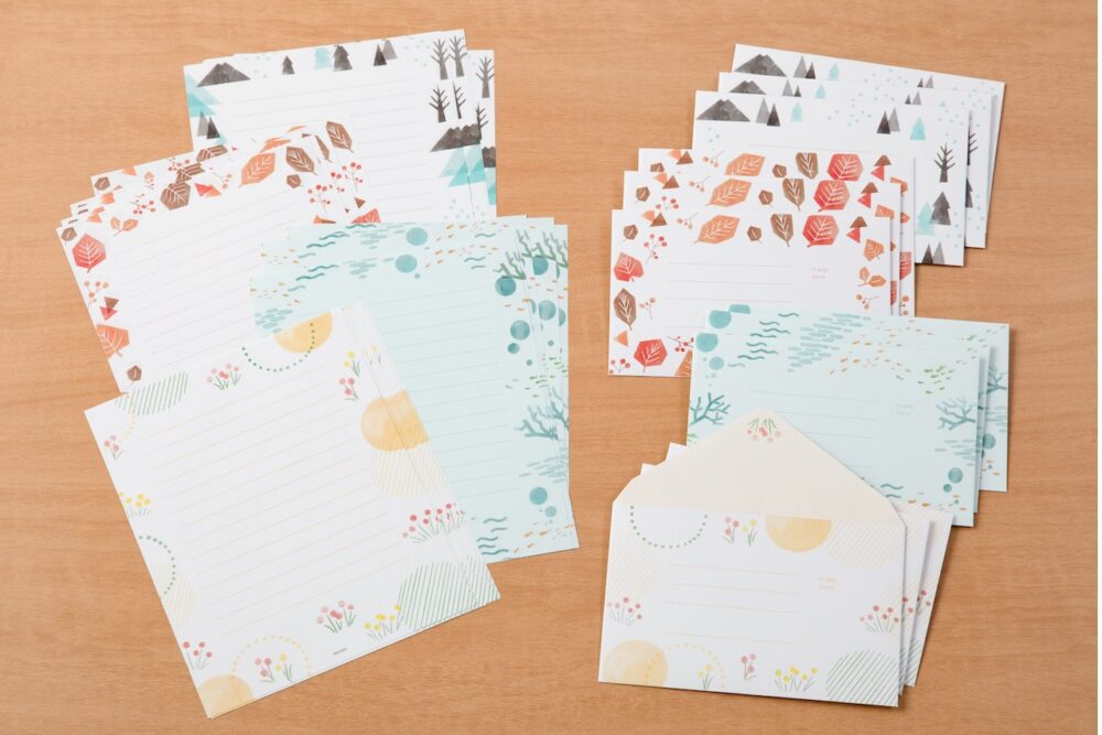 春夏秋冬それぞれのデザインを楽しむことができる便箋と封筒のセット。手紙を送るタイミングに合わせて、その季節を感じられる便箋と封筒を使う事ができる。定期的にやり取りのある相手に手紙を送る際に、1年間デザインの変化を楽しみながら送ることができる。