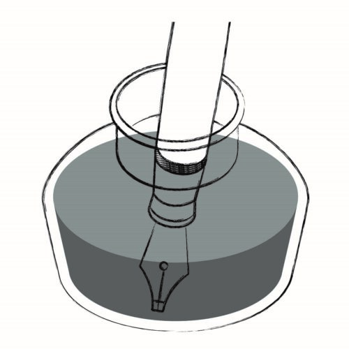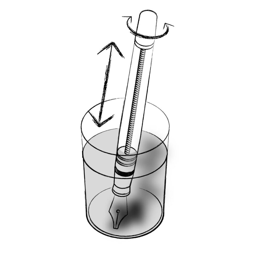 回転吸入式で上手くインクが吸入できない、少ししか吸入できない、という理由の多くは、ペン先をインクに浸けるときの水位が足りず、空気を遮断しながら吸入できていないことが考えられる。首軸まで、あるいは首軸ぎりぎりまで沈めて吸入するようにしよう。