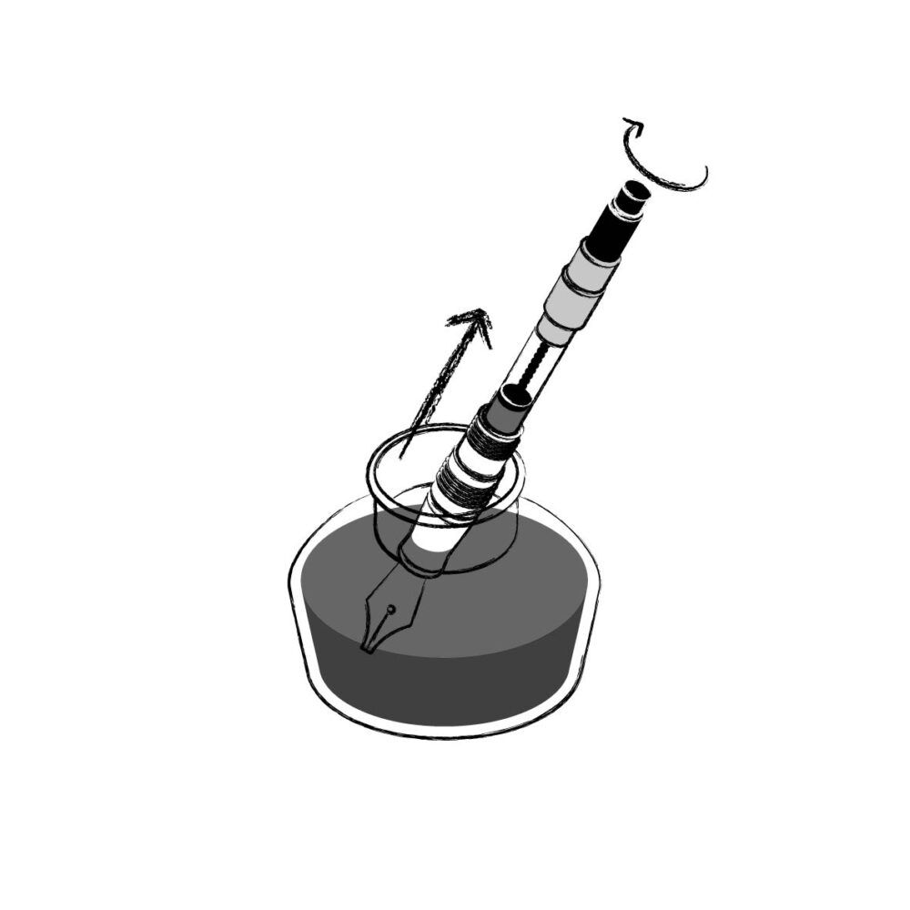 コンバーターの尻軸を左回転し、内部のピストンをめいっぱい下げてインクの水面下にペン先を入れる。