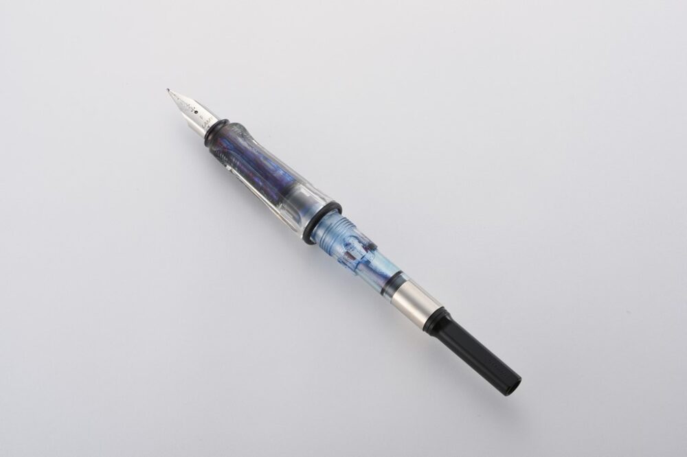 吸入したら少しだけ尻軸を左回転させ2~3滴戻して、ペン先やペン芯に付いたインクをきれいに拭き取る。これでインクの吸入完了だ。