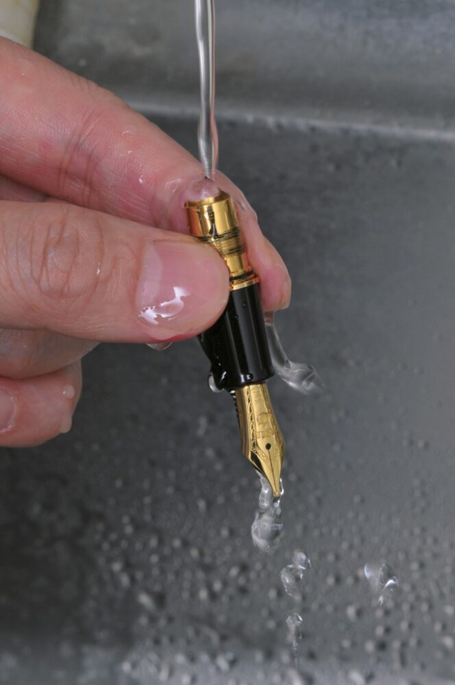 カートリッジを抜いた首軸を、流水で流した後、水に入れておく。インクが流れ出るのを待ち、水がインクで汚れたら水を入れ替える。インクの色が出なくなるまでこれを繰り返す。