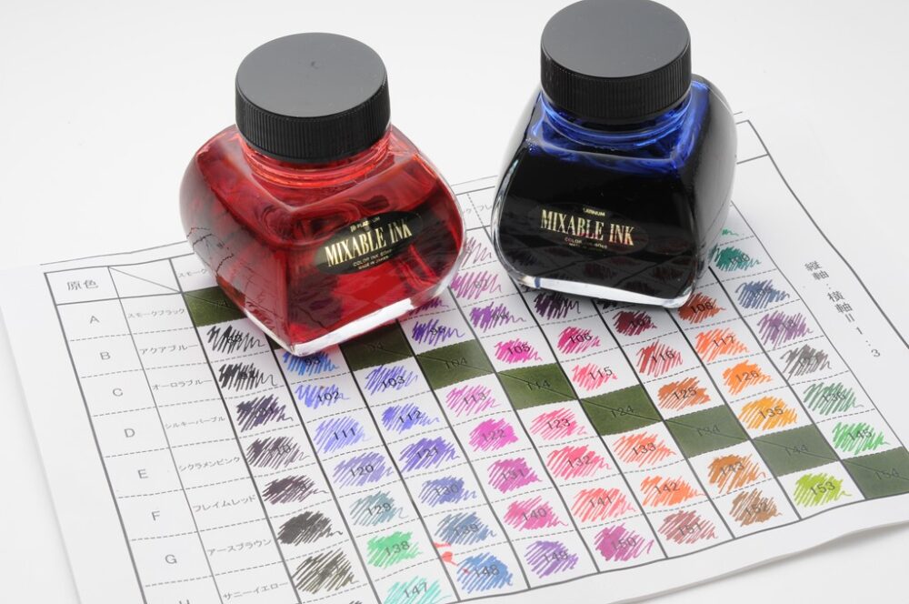 プラチナ万年筆の「ミクサブルインク」は、混色可能な水性染料インク。通常、異なるインクを混ぜることはタブーだが、全9色はpHや表面張力、粘度などを揃えており、混ぜても組成が変わらないため安心して混ぜることができる。調合しながら自分好みの色の追求を楽しみたい。