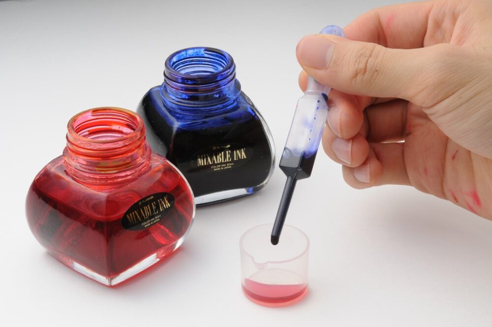 「インクを混ぜるわけがない」と思うかもしれないが、ペン先やペン芯にわずかにインクが残っている状態で違う色を吸入するだけでも、インクは混ざってしまう。同じメーカーであっても違う色は混ぜないこと(混色可能なインクを除く)。化学変化で性質が変わることがある。