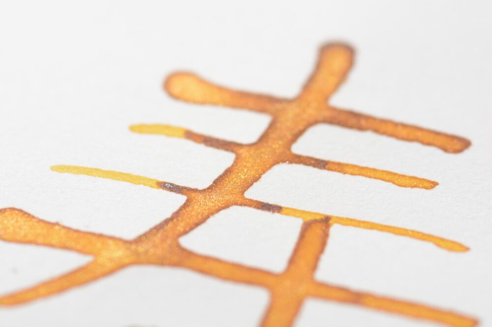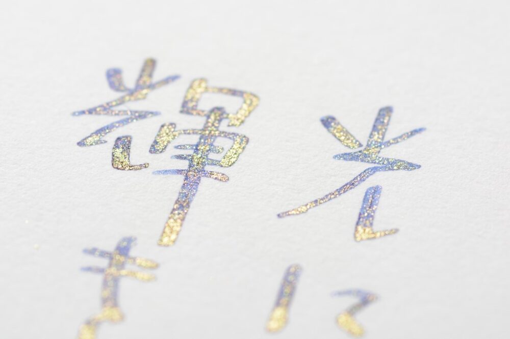 微粒子の金粉・銀粉が入っており、インクの上にラメを散らしたような風合いの線になる。華やかな場面やお祝いの手紙などに使いたい。