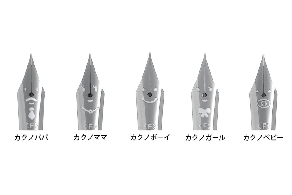 今回発売する「カクノ ファミリーシリーズ」は、初めての方でも正しいペンの向きで使えるように、従来からペン先に刻印されている“えがおのマーク”に、“ファミリー”をテーマにしたパパやママ、ベビー、ボーイ、ガールの5種類の新デザインの刻印を施した。