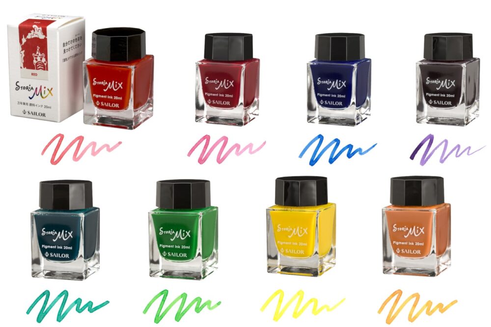 顔料インクは水に強く、にじみにくく裏抜けしにくいという特長がある。また顔料インクははっきりとした筆跡で、染料インクは鮮やかで透明感がある筆跡に。併せて「STORiA MiX を混色するのに便利なキットも数量限定で販売される。