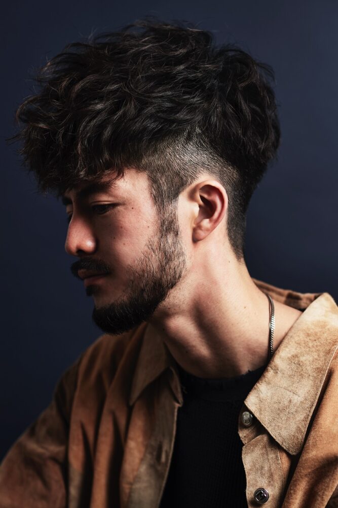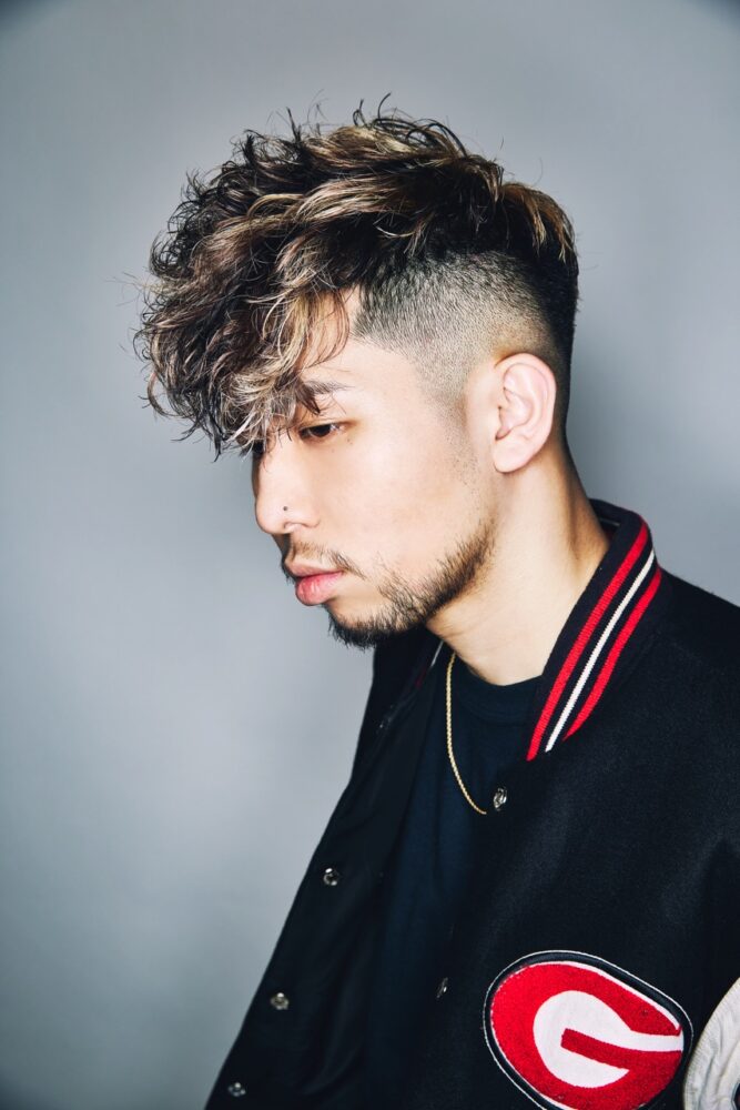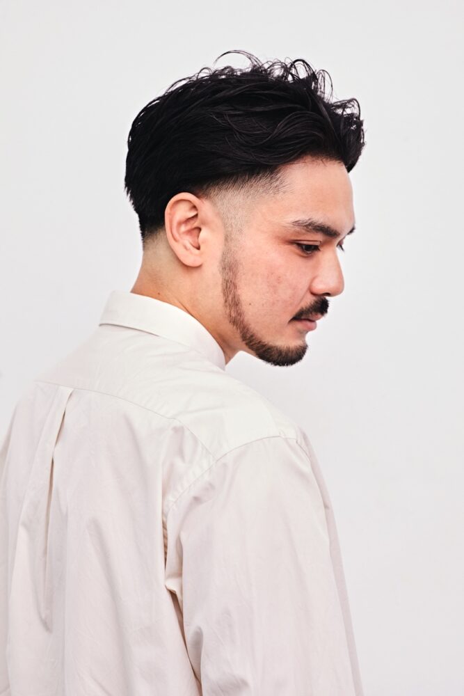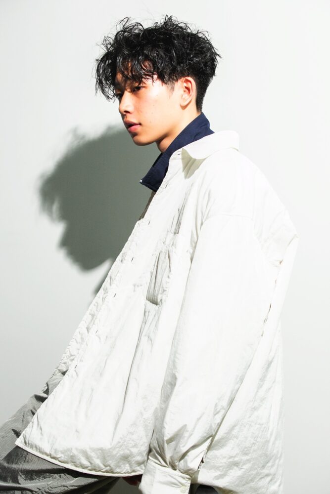 襟足、耳周りは刈り上げの幅を広げて清潔感を出しながら、トップは遊びのあるデザインにしたスタイル。フロントのスパイラルパーマでボリュームとカール感を持たせ、そのほかは柔らかくニュアンスづけ程度のパーマがかかっている。パウダーをすり込んでドライにスタイリングすると◎。