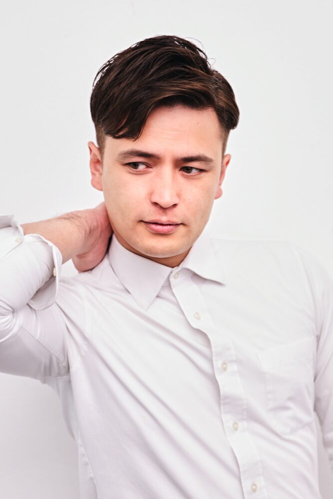 耳上まで刈り込んだマッシュスタイル。すっきりとした耳周りにクセ毛風の隠しパーマを仕込めば、動きの出づらい髪質でも断然垢抜け! 大きめのロッドでボディパーマをかけ、ラフな動きを出している。ハードワックスで束感を出し、額が少し見えるくらいのすき間を作れば爽やかさ抜群!