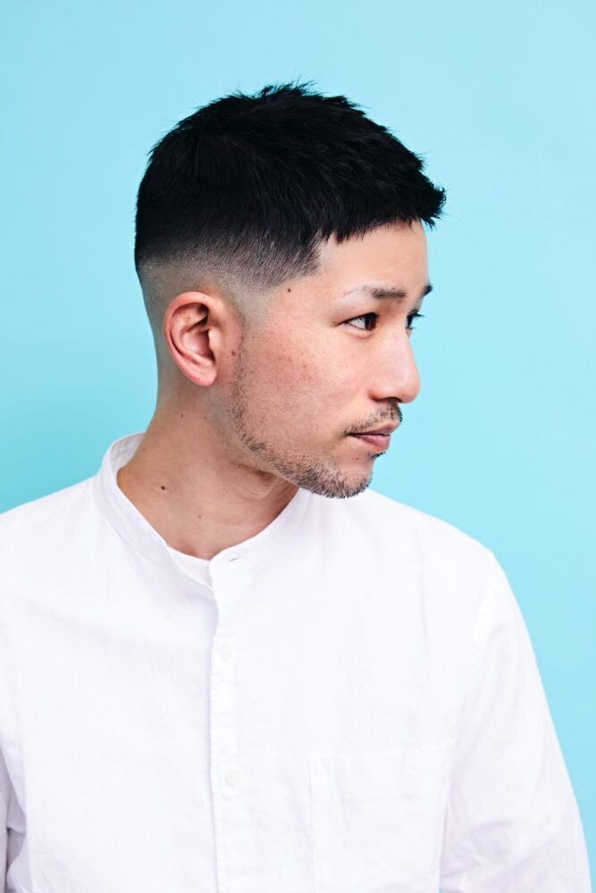 0mmからのミドルフェード。いかついイメージになりがちなフェードも、アレンジ次第でクリーンな印象に。トップはフロントに少しだけ長さを残したショートレイヤーで遊びを持たせる。マットワックスで自然な束感を出すように整えれば爽やかさアップ。