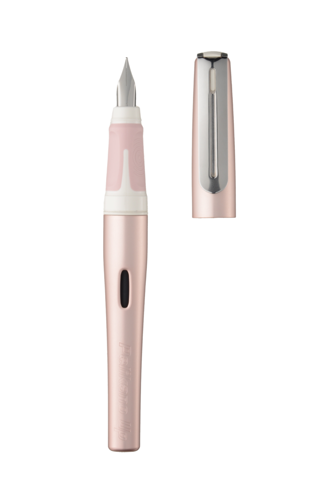 ペリカーノジュニアと同様、使っているうちに正しいペンの握り方になる大中小3つのくぼみがグリップに入っているアルミボディの万年筆。こちらは上品かつキュートな印象で大人にも楽しめる万年筆となっている。