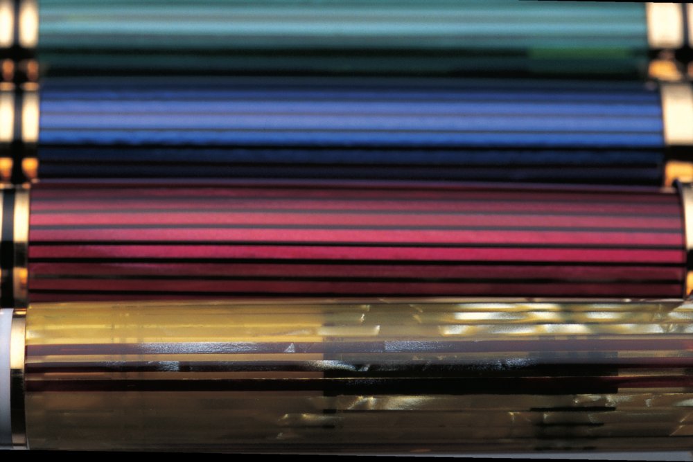 ペリカンを代表するシリーズ、スーベレーンの特徴であるストライプ模様は独特の工法で作られている。まず硬質で光沢の良い色付きの樹脂(プレキシグラス)と透明のセルロース・アセテートを交互に重ねてブロック状に。このブロックを縦にスライスして140×66cmの板を作る。そしてこの板からストライプ模様が鮮明な部分だけを厳選。規定のサイズに切り出すのだが、このときに約6割を廃棄してしまうそうだ。