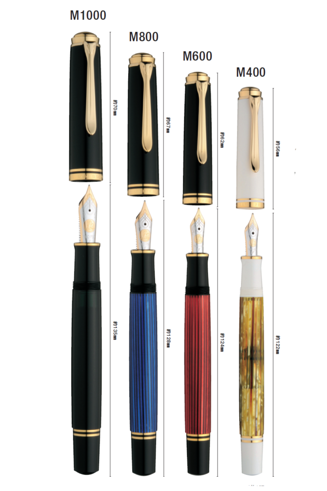 現在は下記の4種類のサイズがあり、それぞれ特有の書き味とバランスが楽しめる。字幅の選択肢は4~5種類。800~400では同デザインのローラーボール、ボールペン、シャープペンシルもラインナップされている(カラーによる)。