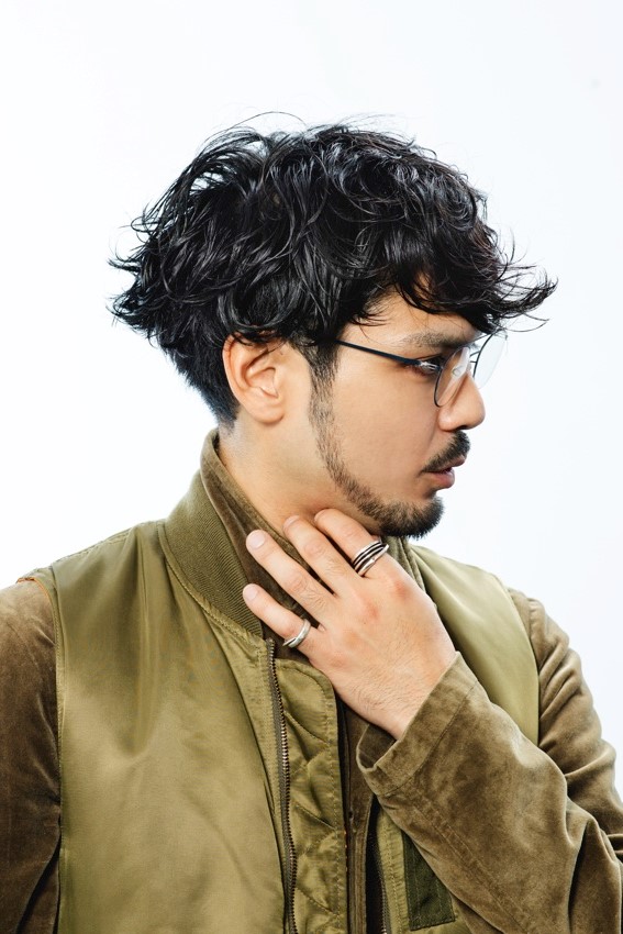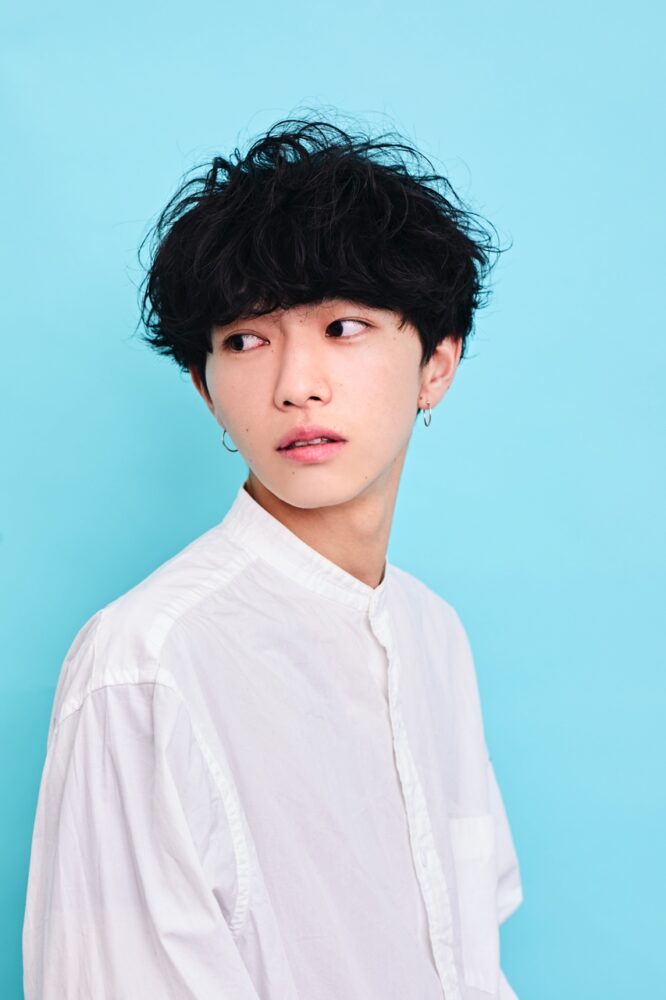 クセ毛風の隠しパーマを仕込めば、動きの出づらい髪質でも断然あか抜ける。大き目のロッドで毛先は逃がした平巻きのパーマで、いかにもパーマっぽくならずナチュラルに仕上がっている。アシメバングで額をチラ見とのぞかせると爽やかな印象に。ハードワックスにスタイリングフォームを混ぜ、トップを立ち上げるようになじませて整えれば爽やかさ抜群に。