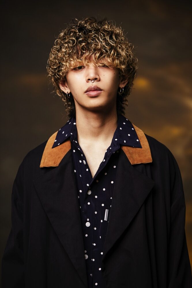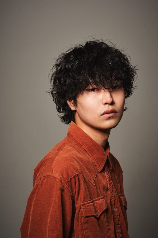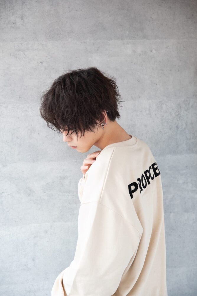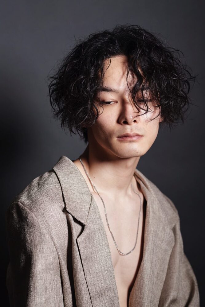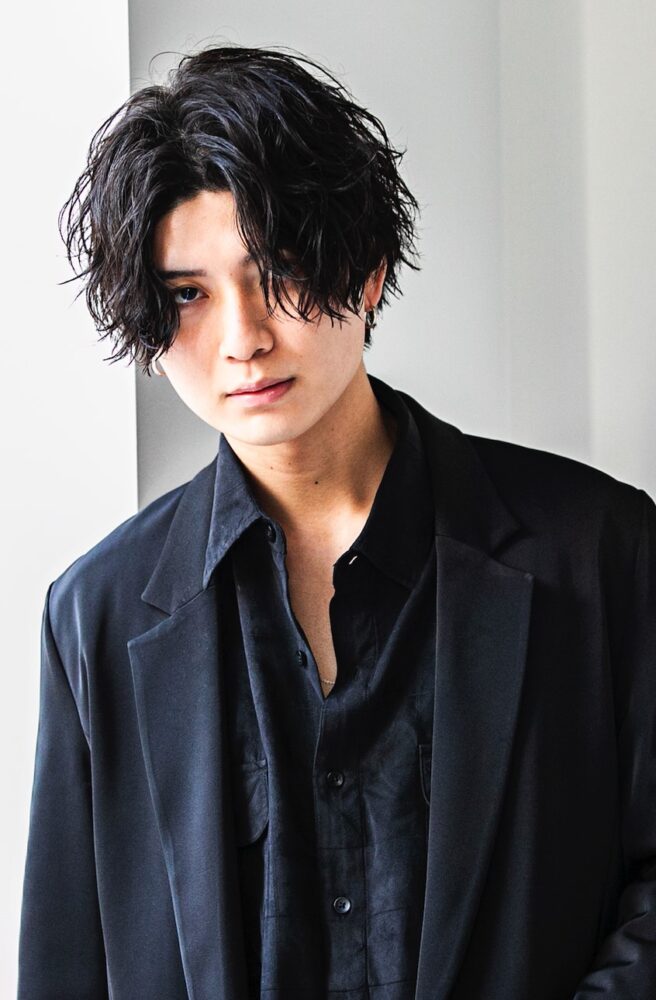 数年前からブレイクしているツーブロの平行マッシュから、ジェンダーレスなムードを加えた前下がりのグラマッシュをマーク。波巻きパーマとのミックスでさらにラフな空気をプラス。ワックスをなじませて束感を整える。