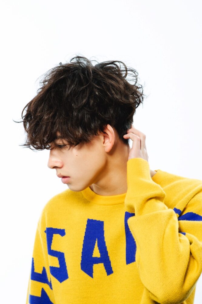 襟足、耳周りは刈り上げの幅を広げて清潔感を出しながら、トップは遊びのあるデザインにしたスタイル。フロントのスパイラルパーマでボリュームとカール感を持たせ、そのほかは柔らかくニュアンスづけ程度のパーマがかかっている。パウダーをすり込んでドライにスタイリングすると◎。
