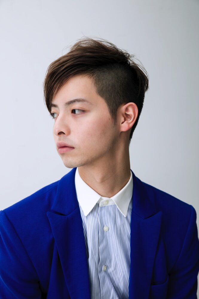 ハチ上を残してフェードに刈り上げ、クリーンに。ハチ上は程よい長さを残しつつも軽さと動きでニュアンスを表現。ヘアバームを全体になじませてから9:1パートに分けてタイトに流す。個性的でありながらクリーンな印象のハイブリットモヒカンだ。