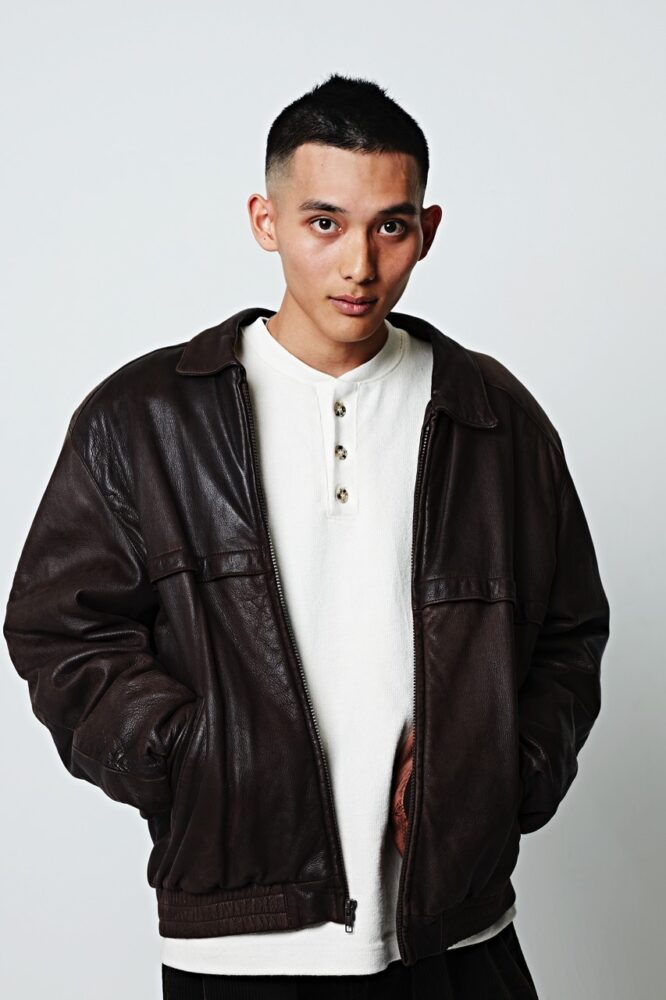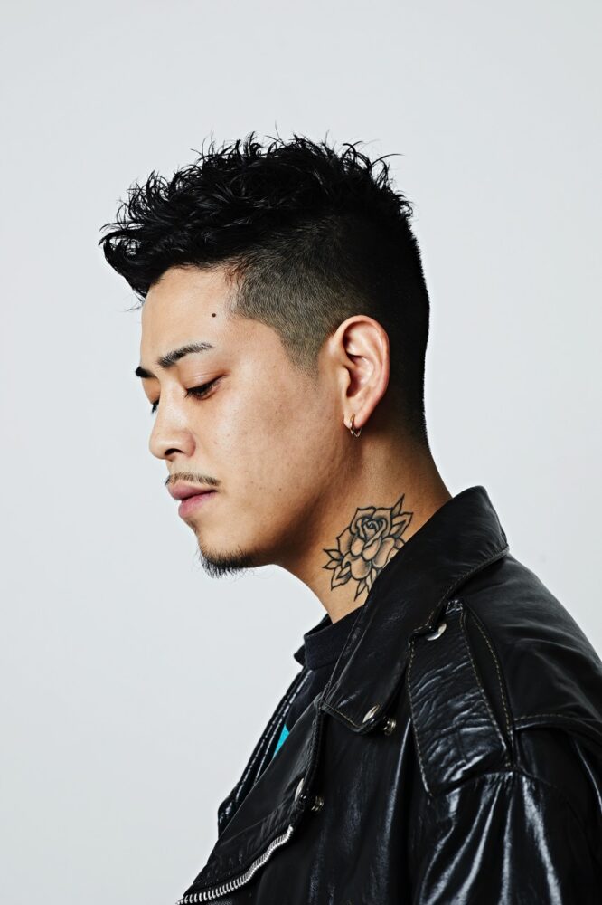従来のモヒカンはアンダーとトップはつなげずツーブロが主流だった。それをあえてつなげることでより男臭いムードをプラス。トップはリッジ感のあるピンパーマでラフに動く束感を演出。ハードワックスをもみ込んでドライ後、グリースをなじませて束感を整える。