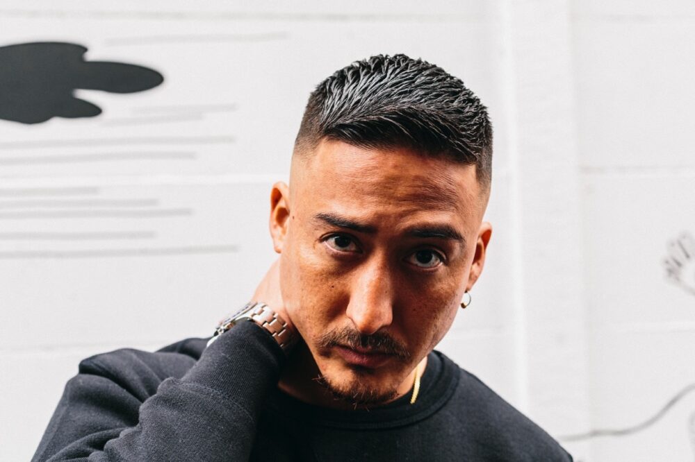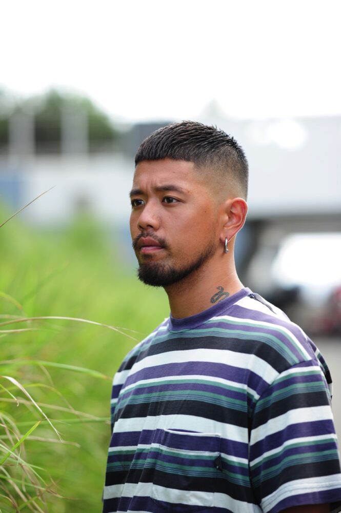 こめかみまでスキンフェードにした、男気を感じる攻めたハイフェードのクロップスタイル。スキン部分を多く見せることで鋭さを演出。前髪もアップバングにすることでインパクト与え、スマートさを表現。ポマードをもみ込んでコームで整える。