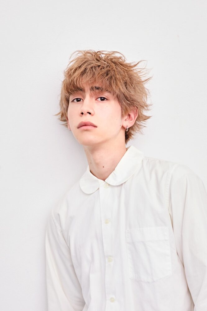 ハイトーンで作る透明感のあるアースカラーと、質感と抜けにこだわったドライマッシュヘアがまるで外国人の子どものようなナチュラルさを表現してくれる。ドライワックスを少量中間~毛先になじませてほぐしながら程よい束感を作る。