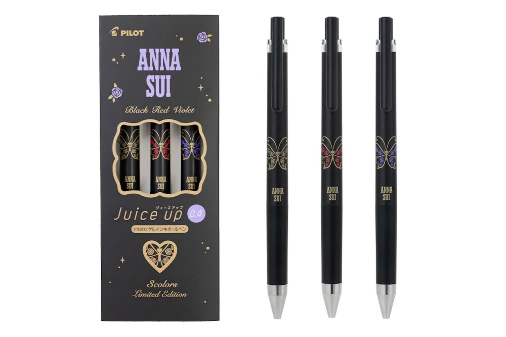 また「ANNA SUI×ジュースアップ3色セット」は、ANNA SUIらしいカラーである、ブラック、レッド、バイオレットのインキ色を選定した3色セット。「ANNA SUI×ジュース」は、インキにモイスチャー(保湿)成分を高配合することでペン先の乾燥を防ぎ、スムーズな書き出しで濃く鮮やかな筆跡を残せるゲルインキボールペン「ジュース」をベースとしている。