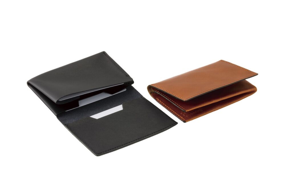 2辺をふわりと折り曲げ、30枚程度のカードを収納する事ができる二つ折りの名刺入れ。カードを入れる側のポケットの1辺を外縫いで留める事により、逆さにしても中身がこぼれ落ちにくい構造になっている。二つの収納部は其々に独立し内側にインデックスを付けることで、カードを出し入れしやすくしている。本体は牛革で使うほどに味わいのでる茶と黒の2色展開。