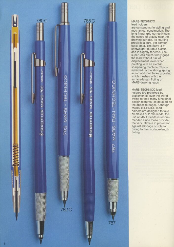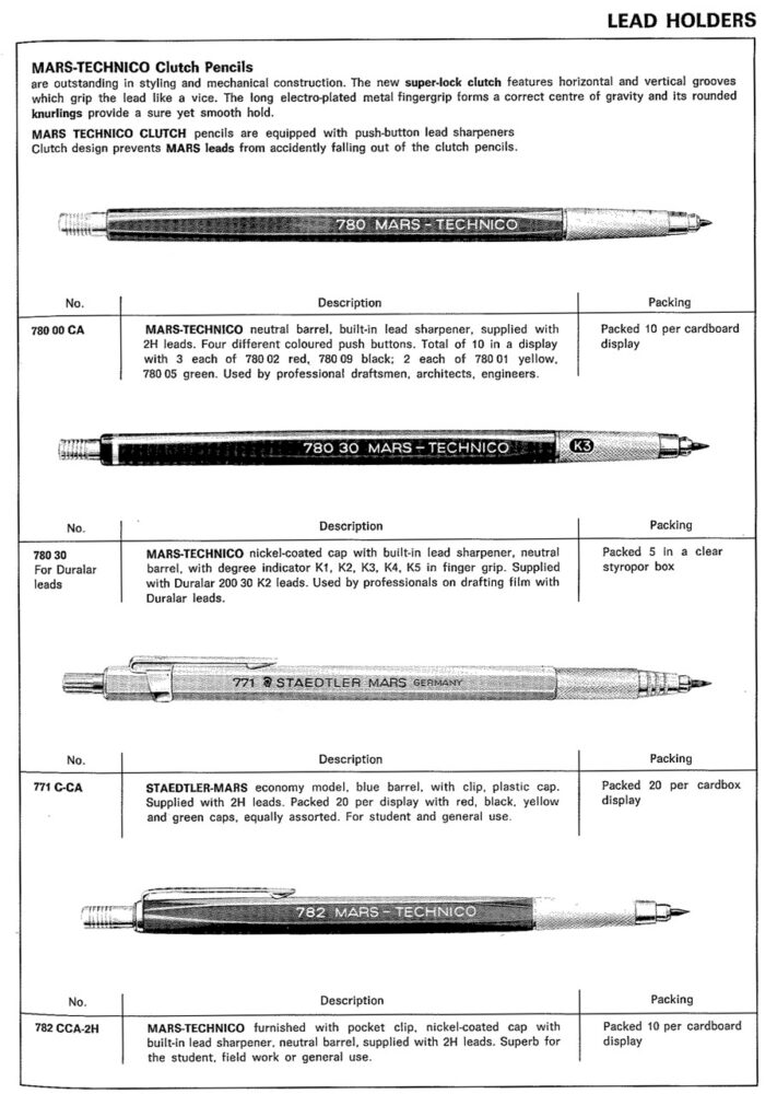 1969年の資料や日本のカタログなどを見てみると、当時の芯ホルダーは780だけでなく、多種多様に揃っていたことがわかる。軸の素材、芯削りの有無、硬度表示の有無などバリエーションがたくさんあった。