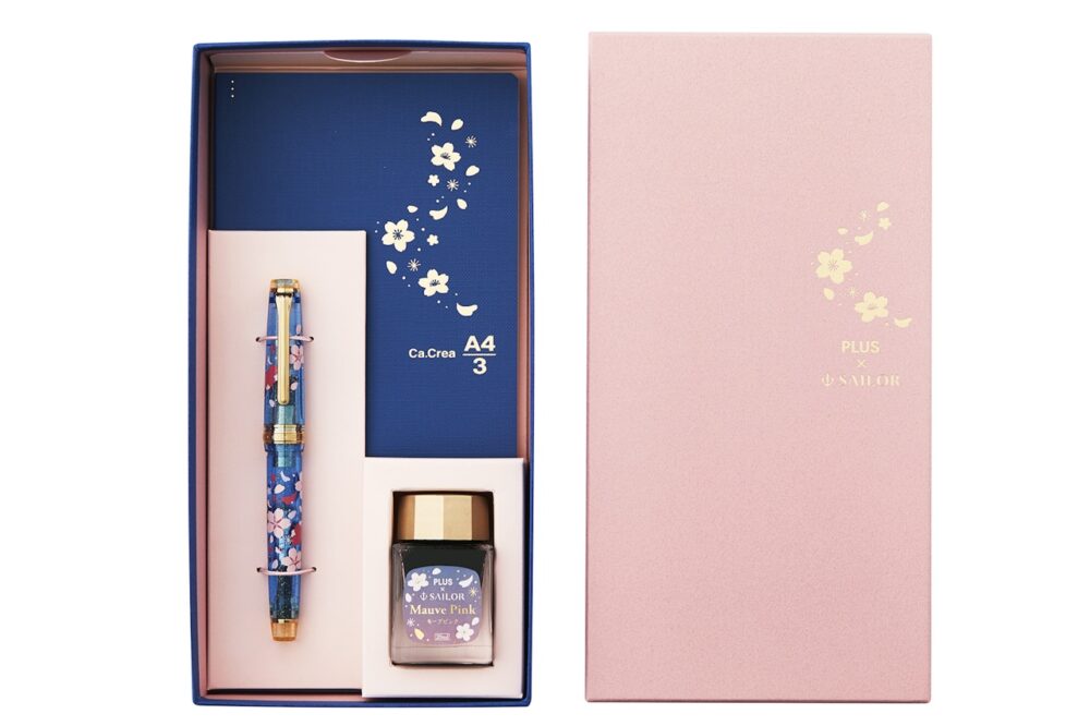 プラスと、セーラー万年筆は、2021年3月に発売して大好評だった「カ クリエ プレミアムクロス× プロフェッショナルギアスリム 夜桜 限定セット」を数量限定にて4月7日(木)より再販売する。