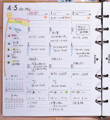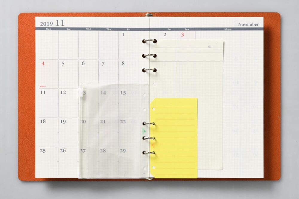 ダイアリーは予定を記入し、未来の相手、または自分との約束を確実に守るツールだ。その未来とは、ほんの数時間後でもあり、数か月先のことでもある。また、行動の記録を残す時にも有効。ダイアリーのリフィルは、月間や週間などを混在できるのもシステム手帳の強みだ。