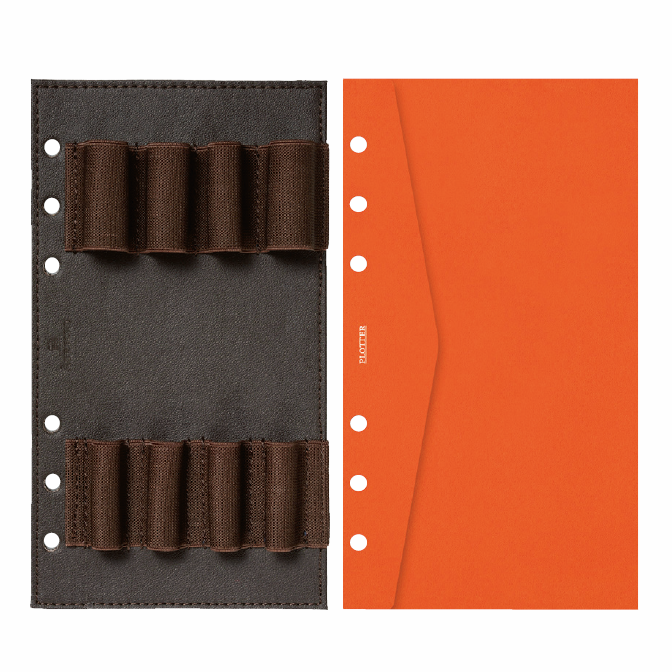 革好きのハートに響く重厚革プエブロのミニ5サイズ。ザラッとワイルドな手触りが次第になめらかに変化し、ビロードのように美しい光沢をまとっていく経年変化を楽しめるのが魅力だ。プロッターのレザーバインダーは、1枚革を独自のバックプレート金具で挟んだシンプルで軽快な設計。
