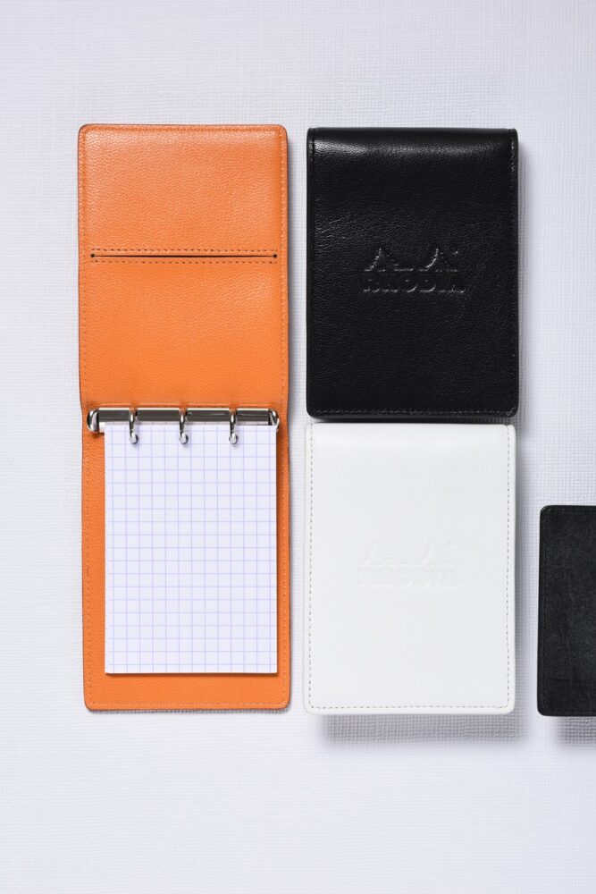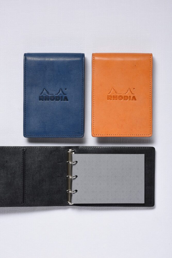 ブロックメモの代名詞「ロディア」がなんと3穴システム手帳になった! カバーは使用革の異なる2 種類。経年変化が楽しい牛革の「シック」と、光沢があり傷が付きにくいゴート革の「ブリオン」がある。カバー色は各3色展開。