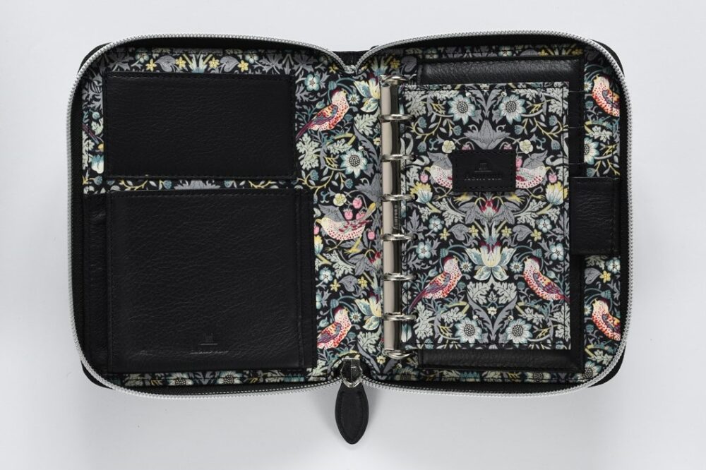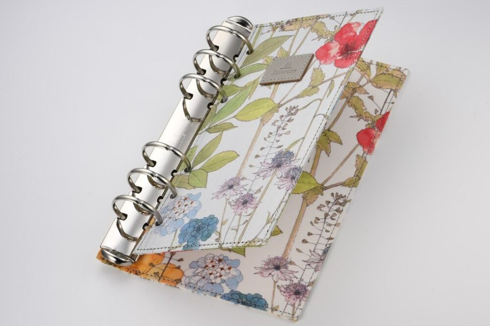 英国リバティ社のタナローン生地を大胆に使ったリフィルパッドポーチ。着脱するリフィルパッド(扉付き)にも同じ生地を使っているのでポーチを開くたびに気分が上がる。WEB 限定モデル。バイブル(リング径25mm):税込28,600円/ミニ6(リング径13mm):税込22,000円