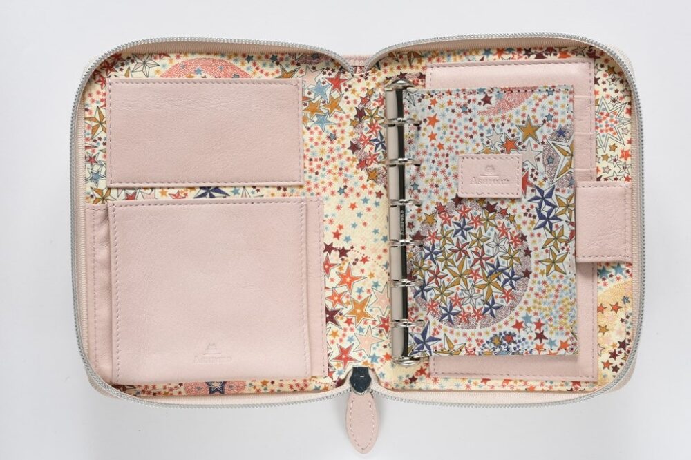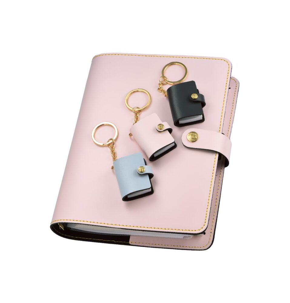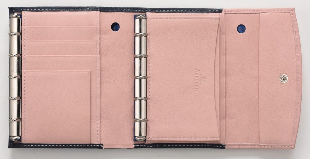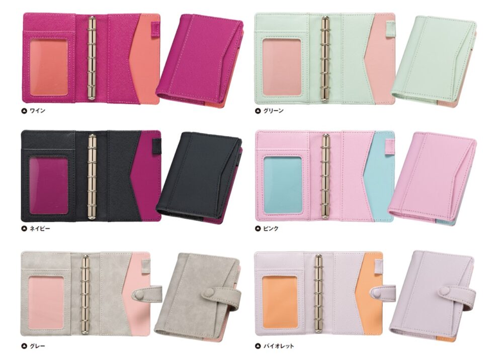 丸みを帯びたかわいい外観だが、手帳と収納の機能がたっぷりあるウォレット(財布)型のシステム手帳。マイクロ5 のダブルリング仕様で、予定やメモを同時に記入したり閲覧できる。リングは着脱できるので、収納に特化した多機能財布としても使える。