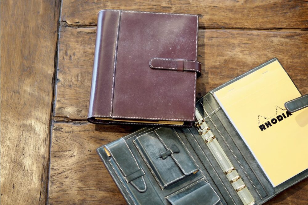 名刺入れ、ペンケース、ポストイットM/Lサイズ、A5 サイズのメモ帳がシステマティックに収納可能。レザーの台紙(下敷き)もセットで装備され、ノート記入時に役立つよう設計。