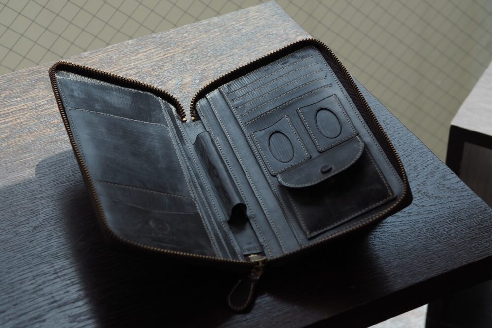 フルジップタイプのオーガナイザー。パスポート、ペン、カード類も収納可能。内装の小ぶりポケットには、アクセサ リー等の細々したものも収納でき、旅先での紛失防止に役立つ。また、レトロな切符ポケットをアクセントで装備。ホールド性の良いハンドル付きで、これ一つで快適に出張へ行ける優れもの。
