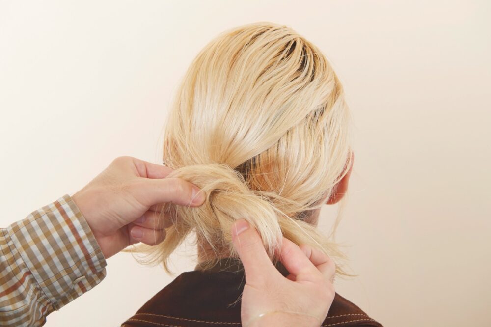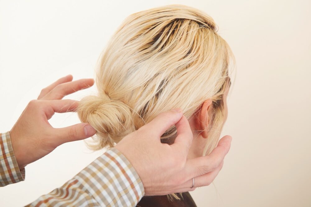 顔まわりの後れ毛とバックショットのバランスが絶妙なスタイル。キレイに作りすぎるとアレンジした感が出るのでラフさがポイント。一見難しそうに見えるお団子だが、実は毛束で輪を作って通すだけの簡単アレンジ。