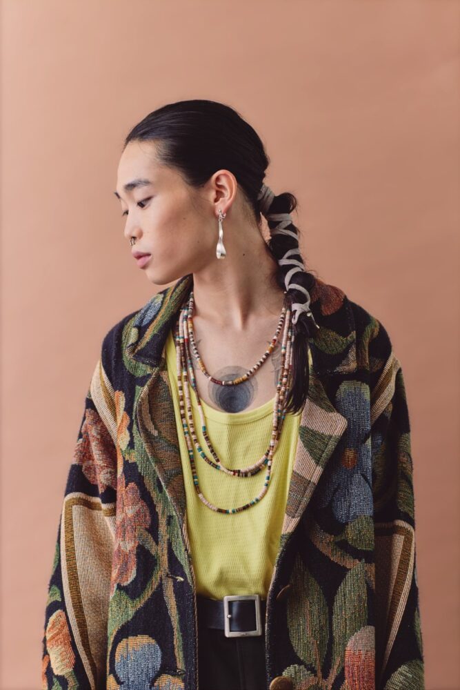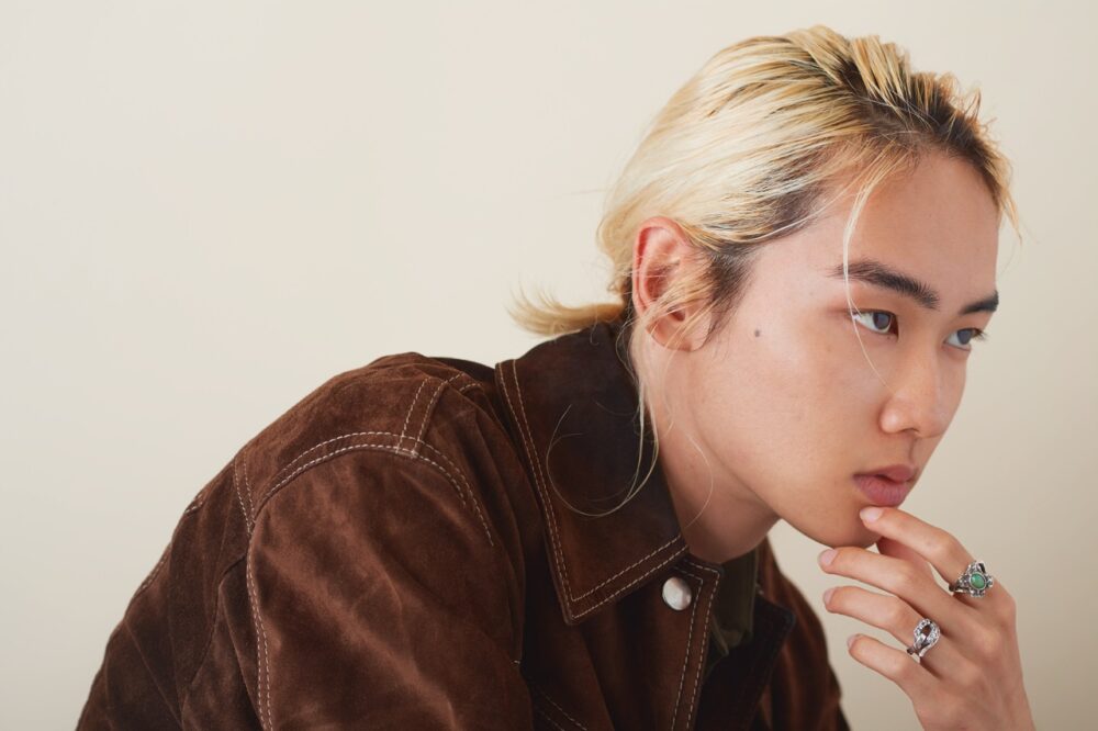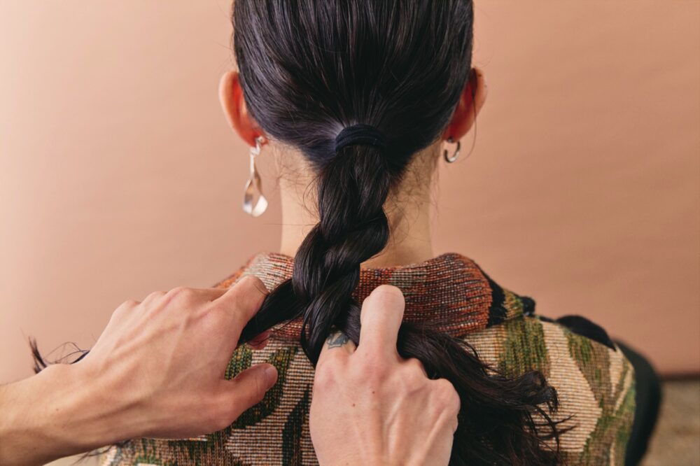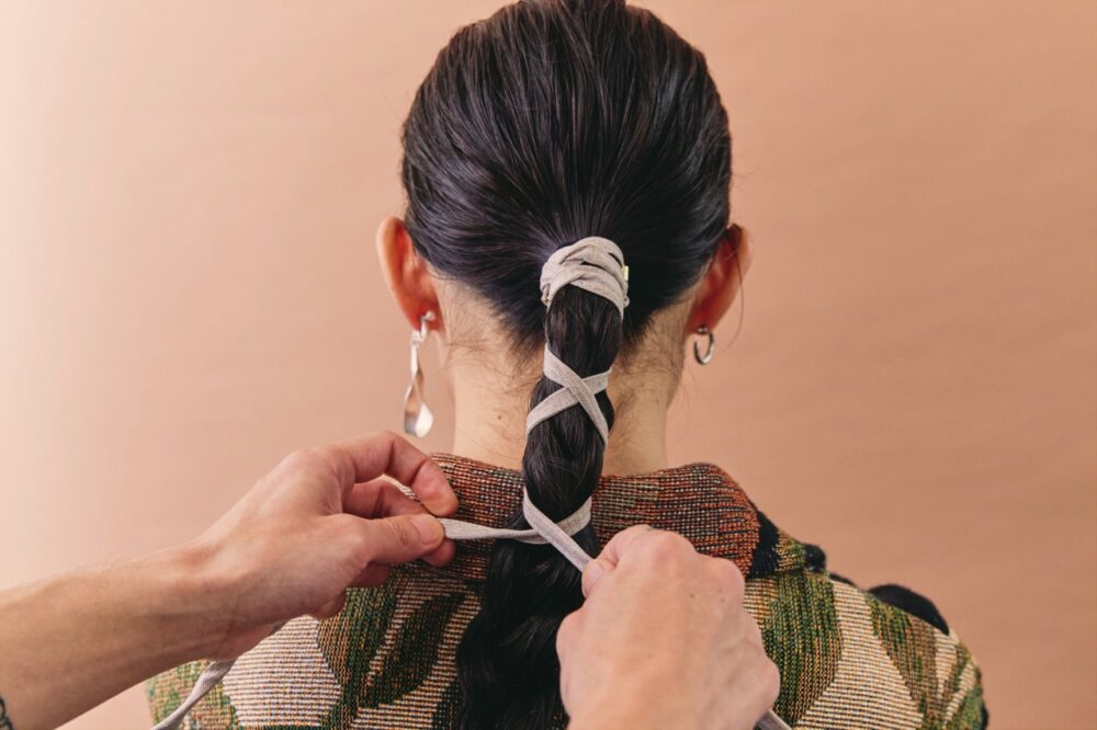 三つ編みにワイヤーポニーを巻き付けて、立体感とトライバル感を出したスタイル。キレイに整っていないほうがかっこいいので、すき間から髪を引き出して武骨さを演出した。