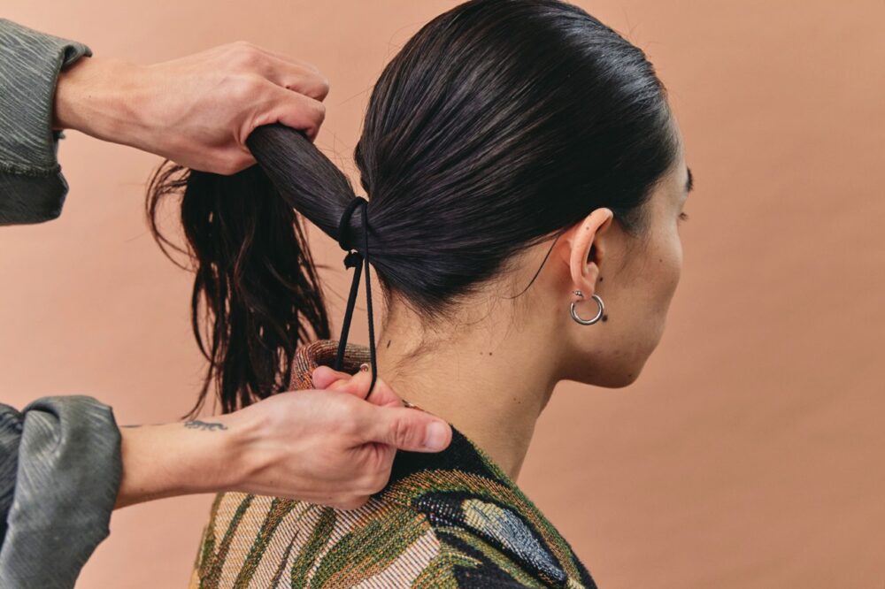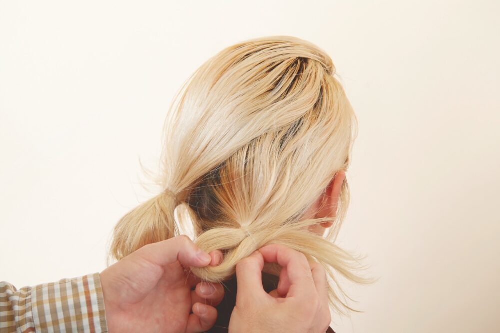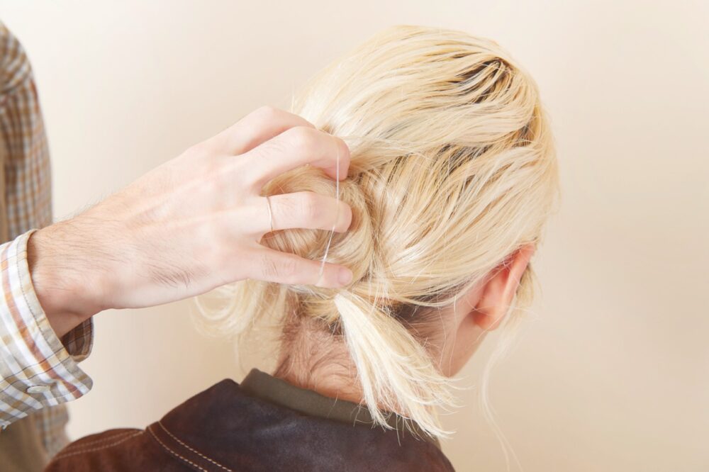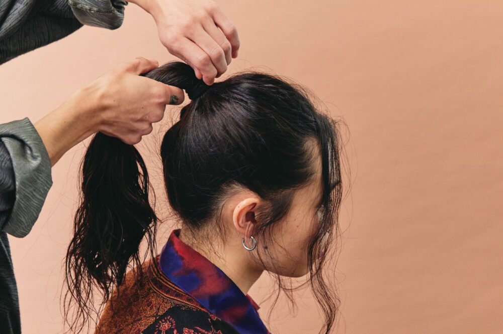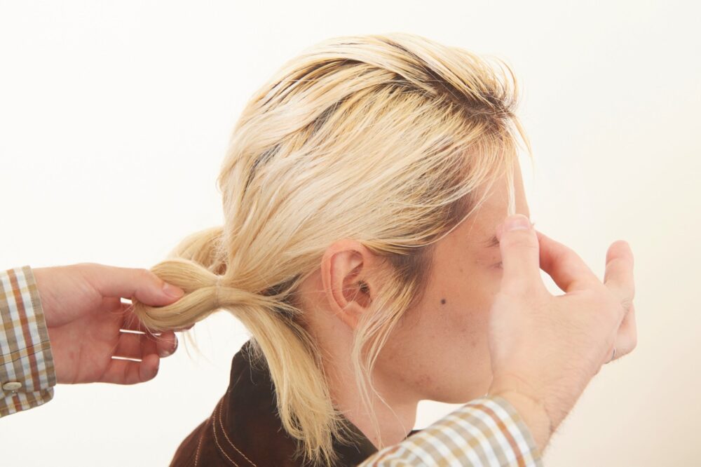 オイルをしっかり塗布し、ウェットな質感にする。7:3ぐらいに分け、斜めにスライスしてそれぞれ毛先を引き抜かずにひとつ結びにする。