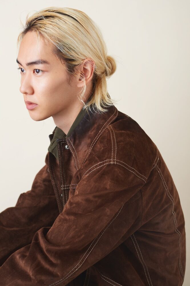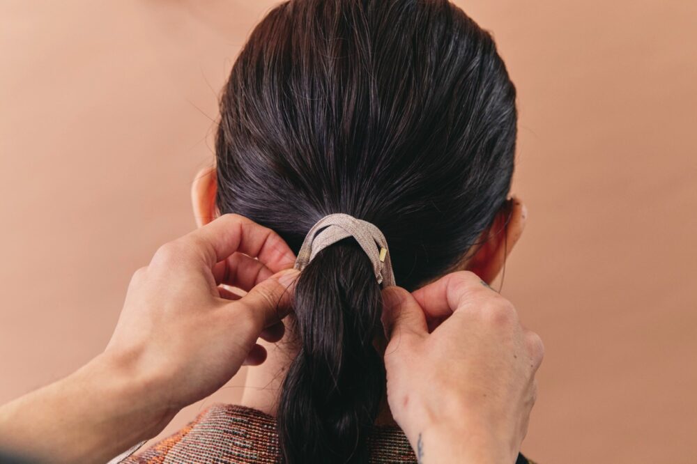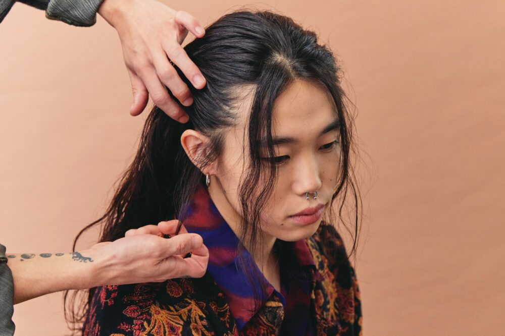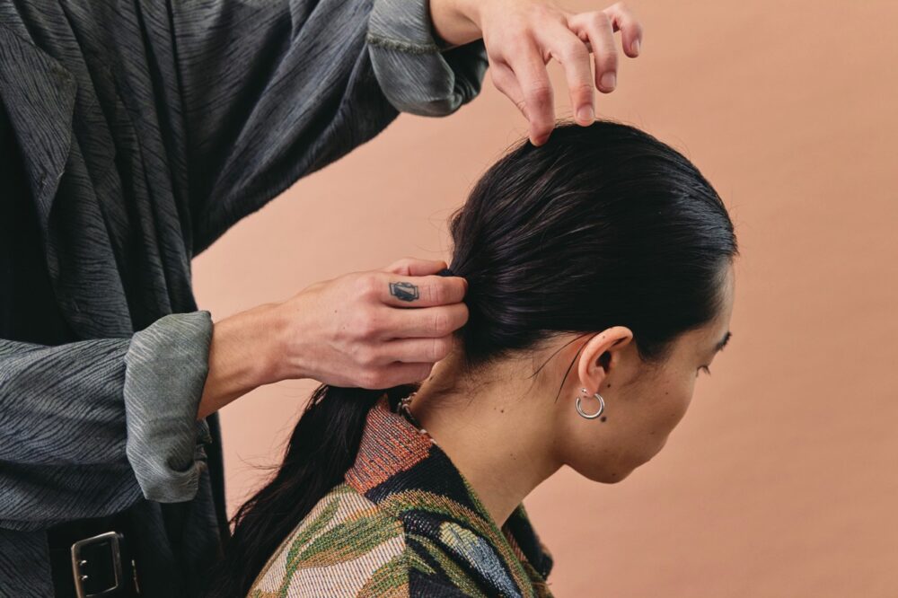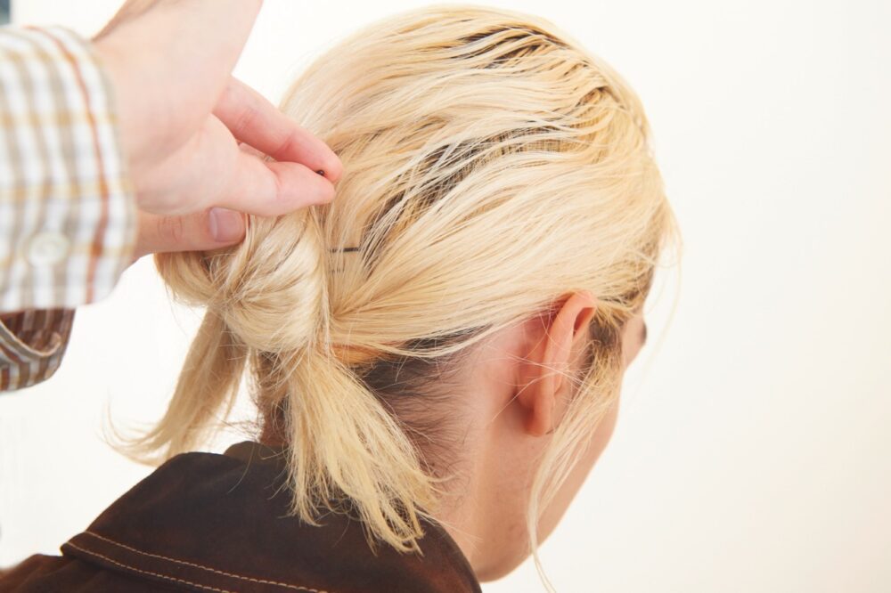 オイルをしっかり塗布し、ウェットな質感にする。7:3ぐらいに分け、斜めにスライスしてそれぞれ毛先を引き抜かずにひとつ結びにする。