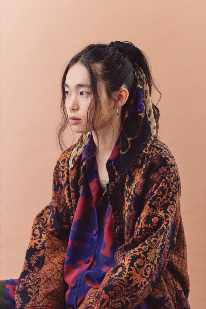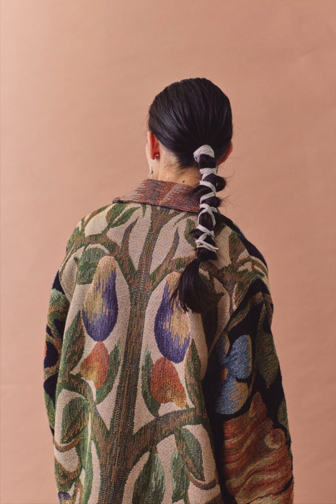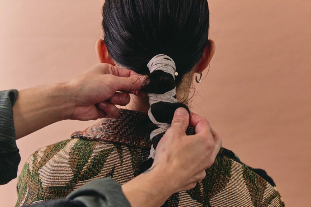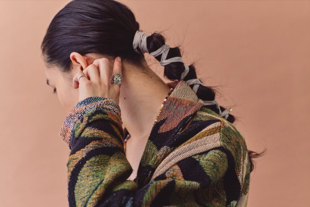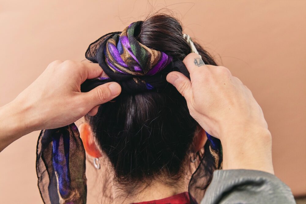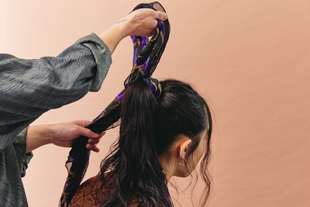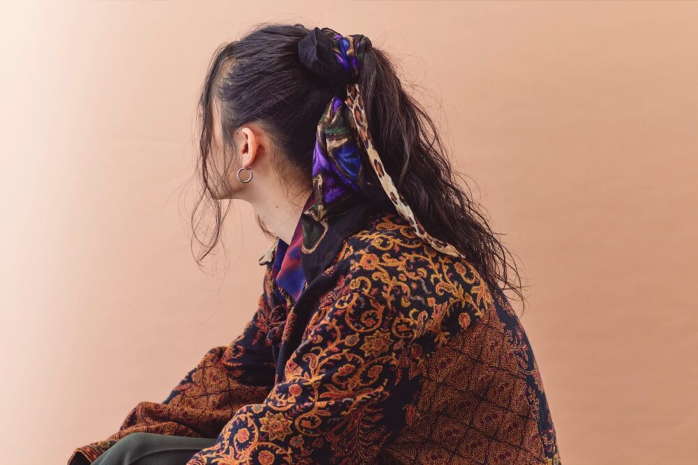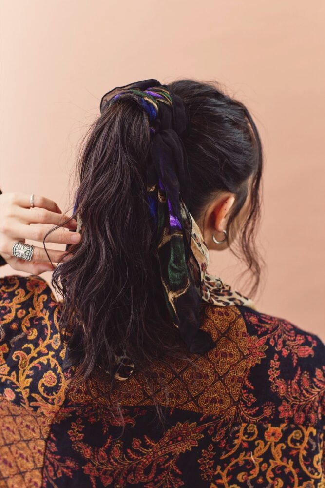 スカーフを重ねづけしてポニーテールと一体化したスタイル。スカーフをリボン結びにするとかわいくなりすぎるのでNG。違う柄のスカーフを重ねづけすることでファッションとトータルでボヘミアンな世界観を表現した。