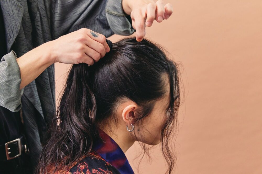 ワイヤーポニーのすき間から髪をつまんでくずす。