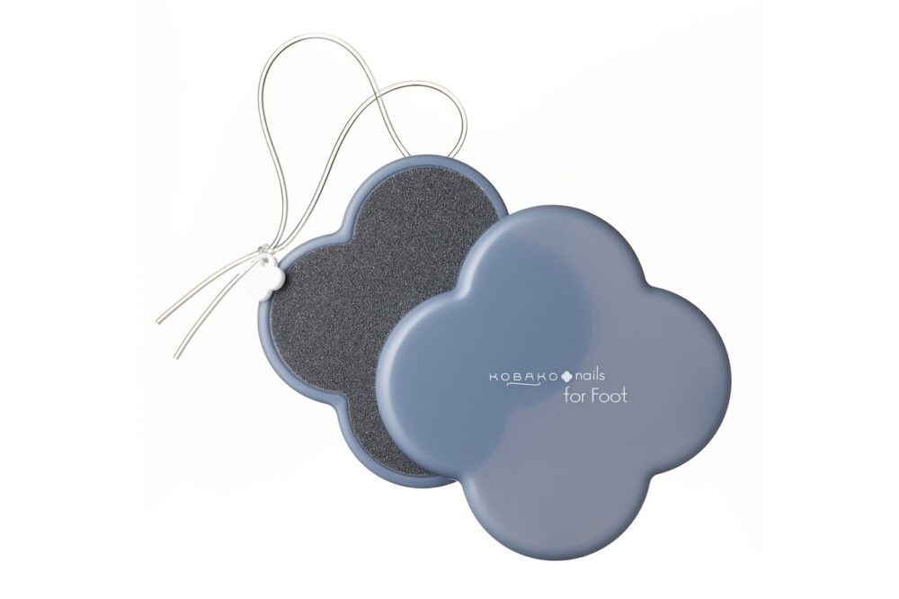 粗目・細目の2面のやすりがついているかかと削り。粗目でかかと全体を削った後に、プレフットケアローションを塗布し、細目でかかとを削ることで、なめらかなかかとへと導く。よりやわらかなかかとに仕上がるように、本キット用に両面のやすりの粗さを細かくしている。