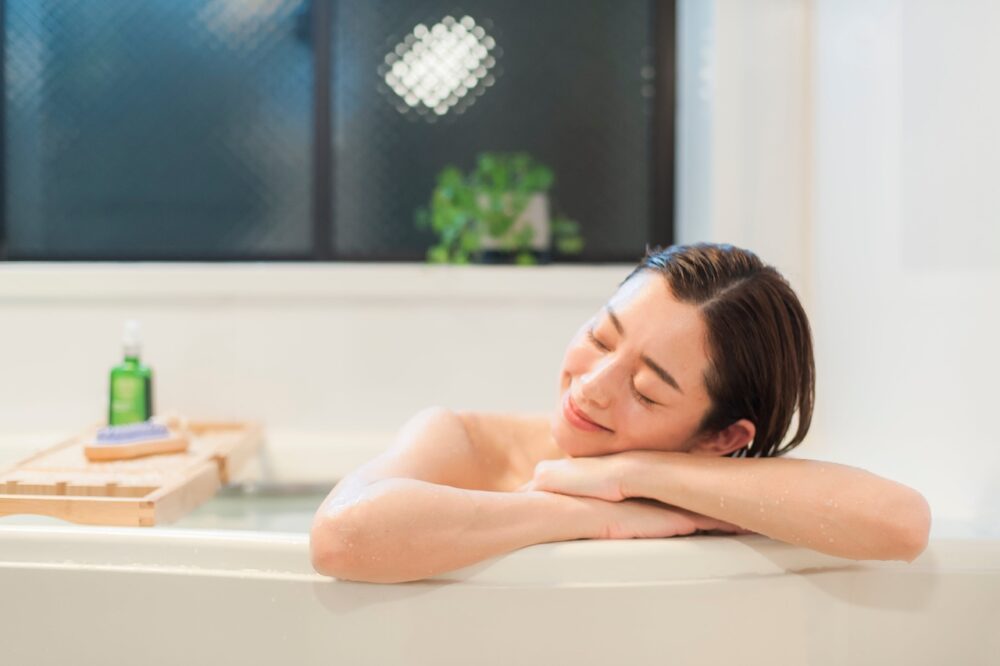 バスルームは家の中でも区切られた特別な空間であり「究極のプライベートエリア」ともいえる。入浴時に身体が温まることによりほぐれやすくなり、胸周りや気になるパーツをマッサージしながら、深くゆっくりとした呼吸を行うことで、リラックスすることができ代謝アップにも繋がっていく。またバスルームではお湯を使うので蒸気で香りがたち、じっくりと香りを楽しむこともできる。