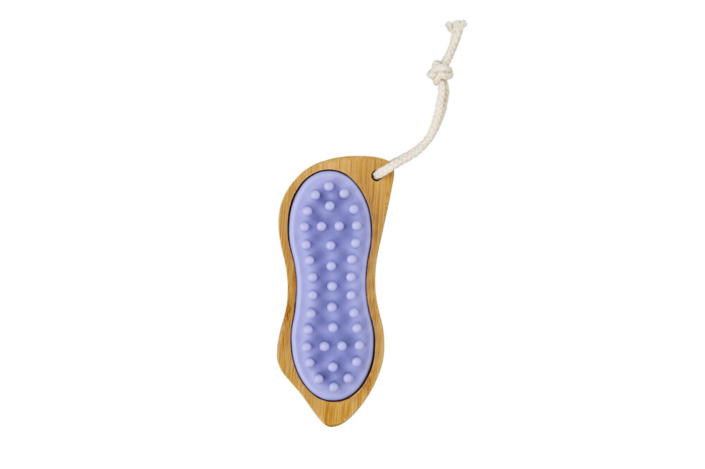 お風呂場でも使えるインバス仕様。大きさの違うカーブが身体のパーツにフィット。柔らかいピン先が脂肪の少なめの胸まわりをやさしくしっかりほぐすことができる。ブラシの先端ポイントは、肩こり解消や食欲を抑える等、気になるツボへのアプローチにも活用できる。