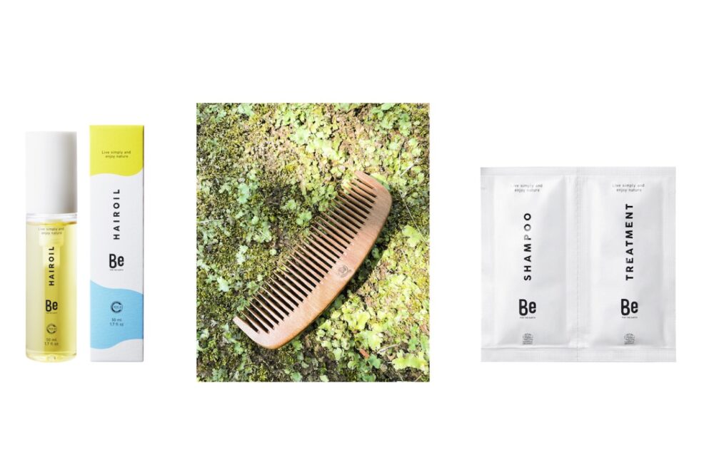 東京利島産の椿櫛と、Beシャンプー・トリートメントをお試しいただけるサンプルサシェのセットを、数量限定でご用意。椿櫛は、日本最古の櫛産地として知られる和泉の職人が歯の1本1本を研磨して椿油で仕上げたこだわりの逸品。椿林の手入れのために伐採される木をリユースし、原木から約3年をかけてじっくり作り上げているので、ヘアオイルとともに長く使うことができる。