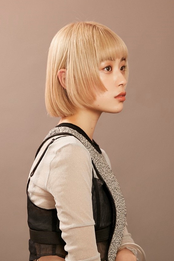ブリーチでハイトーンなクリアブロンドを切りっぱなし風のボブにON。顔まわりに動きや毛束感があるので、重くなりすぎずこなれた印象に。スリークな質感にすれば落ち着いた雰囲気も楽しめる。