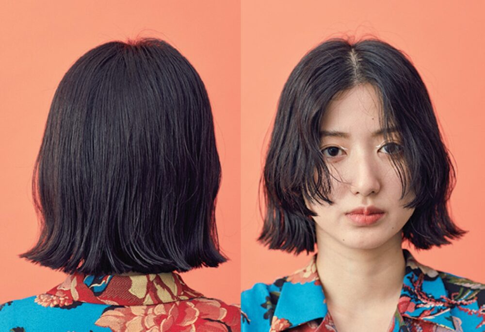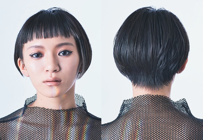 前上がりのラインで丸さを出し、前髪もややワイドぎみに幅を取ることで、柔らかさと女性らしさを表現。ストレートタッチのライン感のあるボブに深みのあるダークアッシュをONして、大人っぽくて清潔感のあるスタイルに。