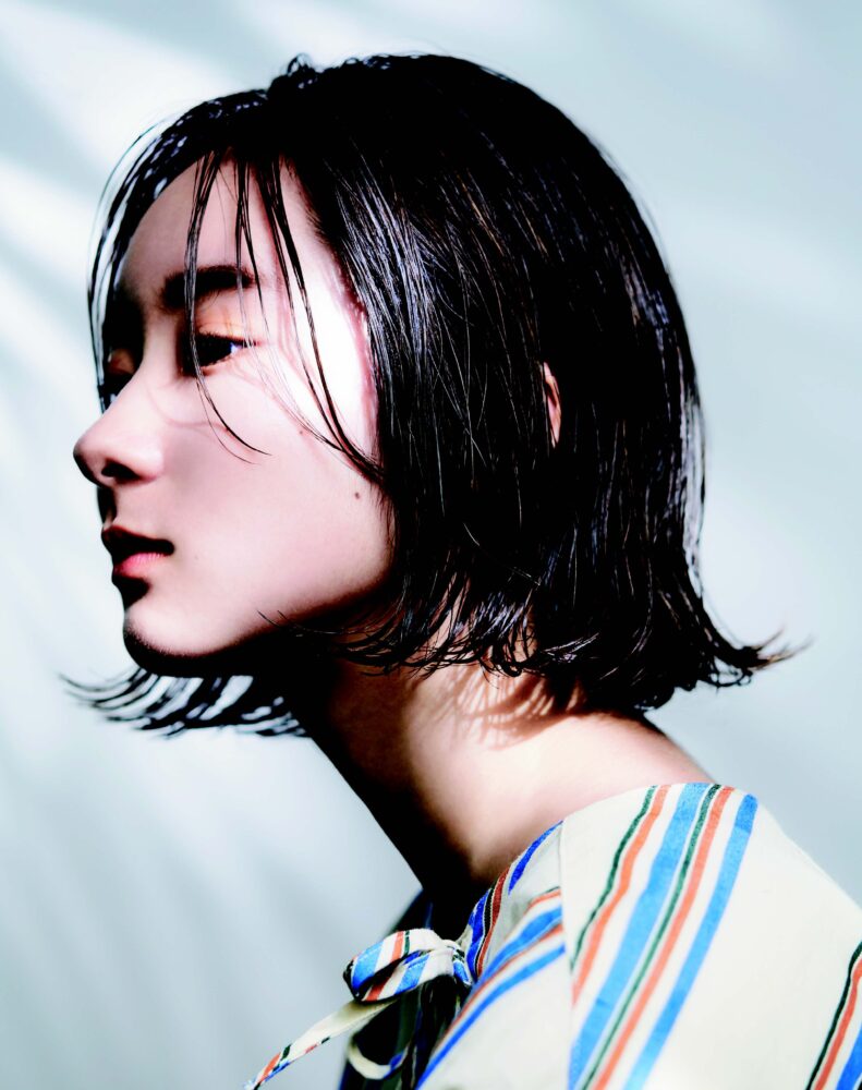 ナチュラルなイメージだが、ただのボサボサではなく抜け感のあるかわいさを意識。淡いミントグリーンのカラーをボブベースにのせ、朝の光に似合わせた。スタイリングもなるべく作りすぎないことを心がけ、カットをそのまま生かして。