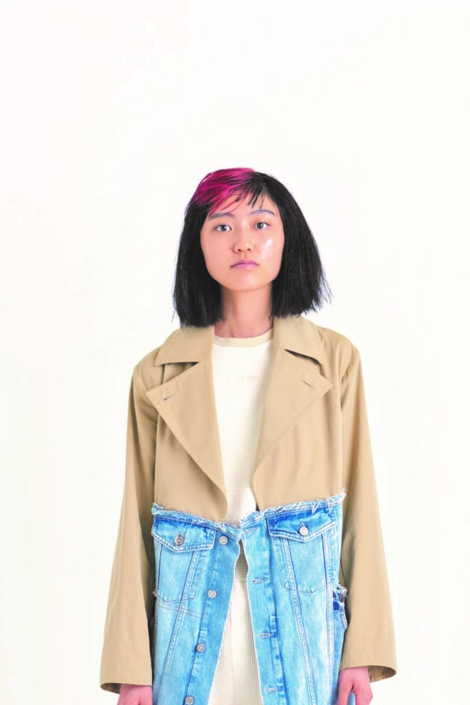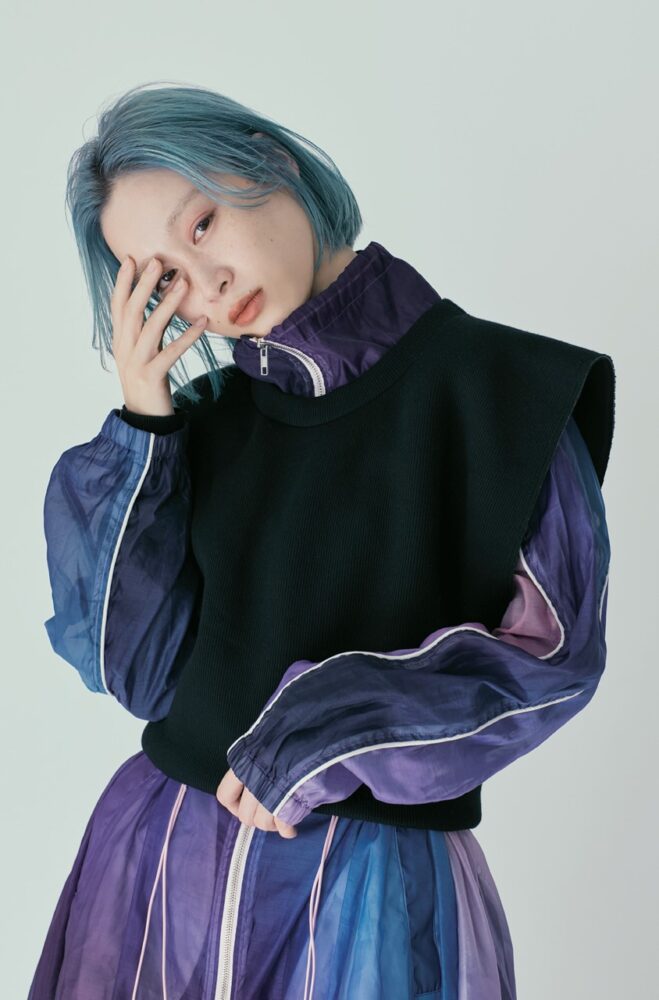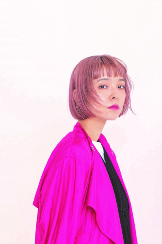 ハイトーン人気の今なら、これくらい大胆なデザインカラーもおすすめ。イメージしたのはなんと“電気”。切りっぱなしボブにピンクのバングは、電気のビリリっとした感じを形にしたもの。素材感のあるアップサイクルコーデのアクセントに。
