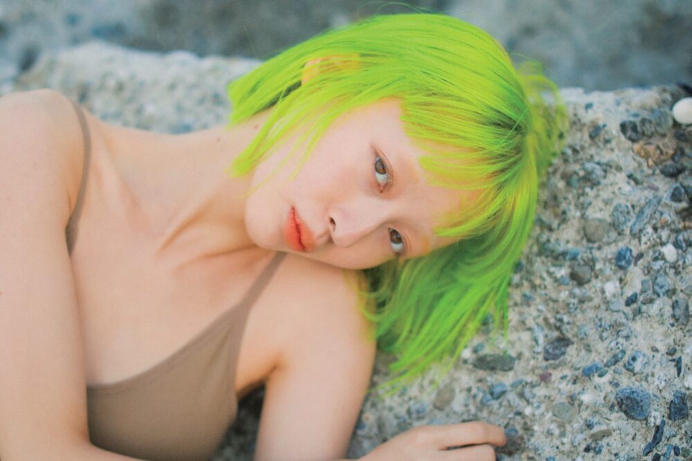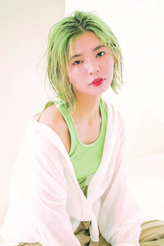 夏だからこそできる、思いっきりはじけた蛍光グリーンカラーに。カットラインをボブにして幼さを残したのもポイント。さらに切りっぱなしのワイドバングに姫カットがパラリと顔にかかるようにデザイン。