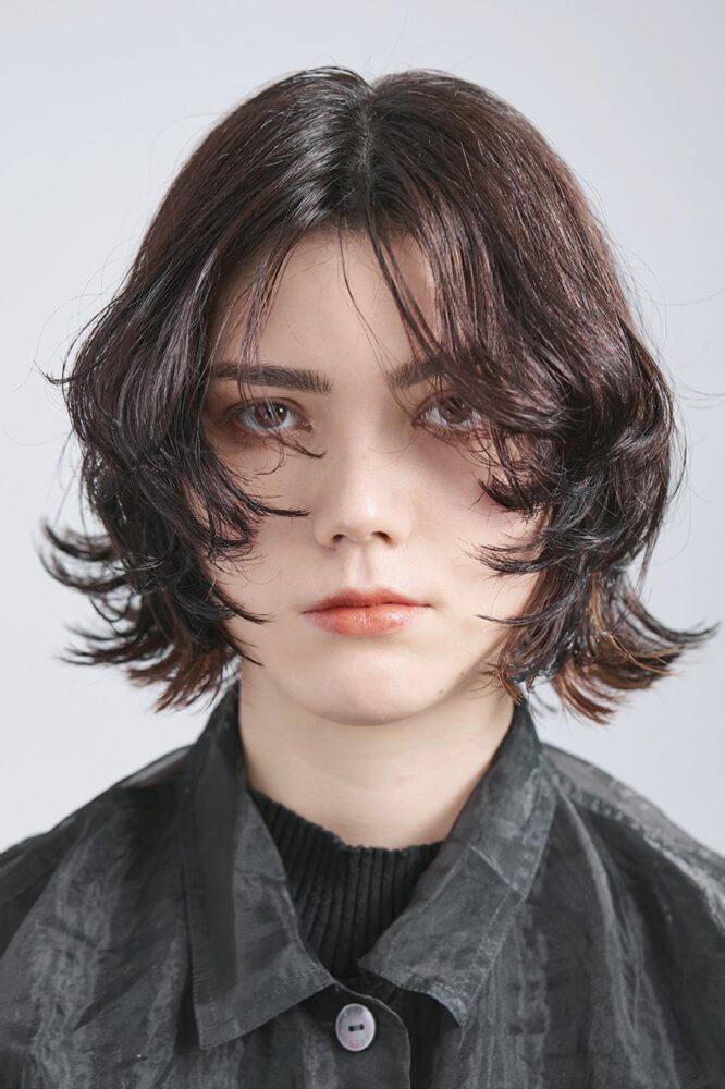 眉上 5 cm以上 のミニバングは、ウルフやボブなどエッジィなデザインにぴったり。バング幅は広めに設定しつつも重くせず、額に沿うよう毛先にはピンパーマでヘルシーな肌感を好サポート。